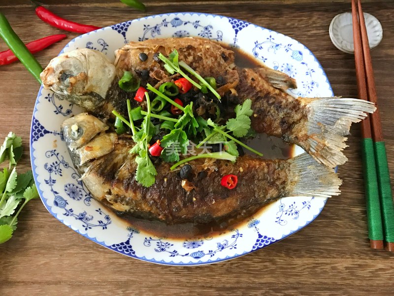 4锅内热油后下鲫鱼小火煎至两面金黄,盛出备用