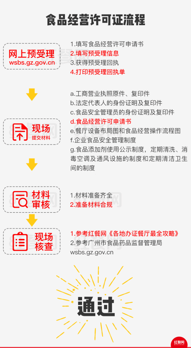 备注:以上材料均需提交A4规格的复印件,并盖申报单位公章,并手写“复印件与原件相符”字眼。另,以上流程仅限普通餐饮食品经营许可证,申报单位食堂、中央厨房和集体用餐配送单位的食品经营许可证有差异。
