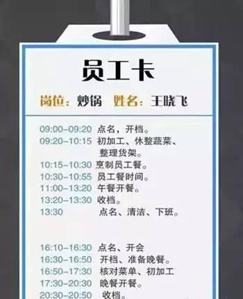 有天上午11:40我去巡查厨房,在厨房外面跟一名砧板师傅撞了个正着,此时虽然未进入就餐高峰期,但砧板师傅理应在砧板旁待命。当时我便认为此人跑到厨房外肯定是偷懒,但仔细一看他的“员工卡”发现,在11:30-12:00间他的主要工作是补齐备货,他此时正打算去储备间取小料。多亏了这张员工卡片,避免了一场错误扣罚。
